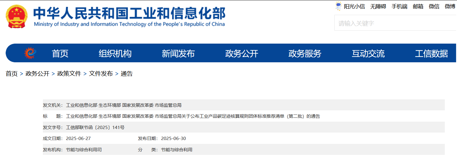 工業(yè)和信息化部等四部門關于公布工業(yè)產(chǎn)品碳足跡核算規(guī)則團體標準推薦清單(第二批)的通告 詳細>>